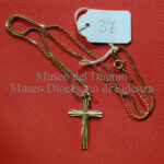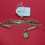 Catenella formata da anelli ovali piatti con alle due estremità un anellino e l’aggancio a molla per la chiusura; sull’anello piatto al quale è attaccato l’aggancio vi sono tre punzoni:…