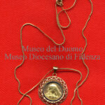 Sul dritto ha un’immagine sbalzata del busto della Madonna, di profilo vs sn, fissata – interposto un dischetto lucidato – con un rivetto a una losanga esistente sul rovescio della cornice, formata da…